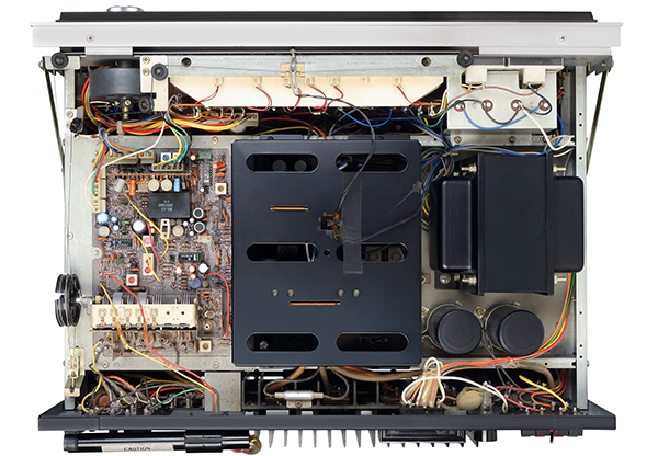 Fent: A nagyméretű transzformátor és a lineáris tápegység (jobbra) látja el az MM / előerősítő / végerősítő fokozatot, valamint a hangszínszabályzó áramkört (középen), továbbá az AM/FM tunerpanelt is, amely zsinór- és fogaskerék-meghajtású, változtatható (hangoló) kondenzátort tartalmaz (bal alsó rész).